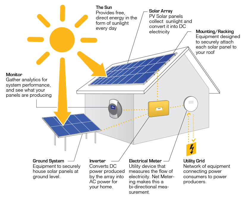 Light hits the solar panel with photons (particles of sunlight). The solar panel converts those photons into electrons of direct current (“DC”) electricity. The electrons flow out of the solar panel and into an inverter. The inverter converts that “DC” power into alternating current or “AC” power. AC power is the kind of electricity that runs your household appliances.